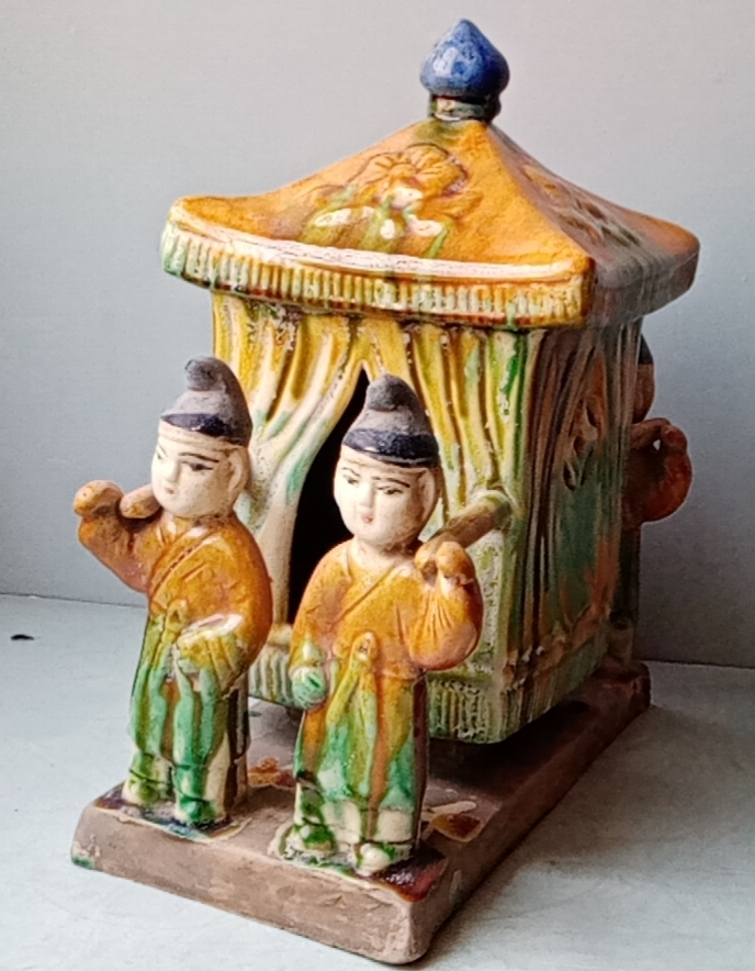 唐三彩部分以陪葬用器为主,本次展示的四人抬桥三彩器物,是由安徽资深藏家刘全海老师提供的。无论整体构思布局还是捏塑工艺都十分精湛。人物形象生动与花桥比例大小十分协调。微观胎釉各项老化痕迹明显,无人为作旧打磨、锻造、熔炼 、无化学侵蚀等现象,原生性痕迹与次生性痕迹清晰明朗可见。此器历经千年能保存状态完整实属不易!是研究取证唐代三彩中不可多得的器物,十分珍贵!